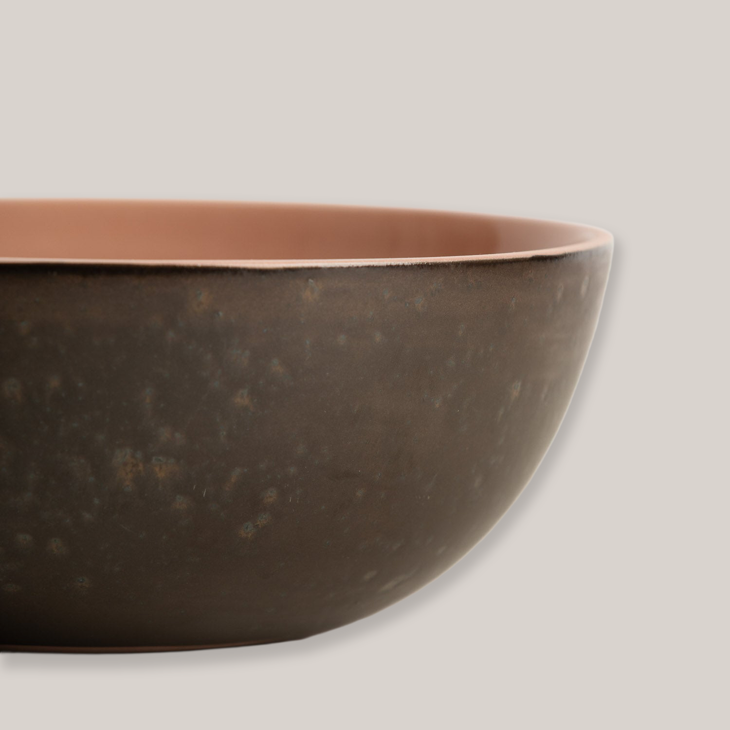 Rooted and quietly dramatic, the Relic Serving Bowl brings a grounded presence to the table. Its moody, hand-painted exterior has the soft texture of worn-in material- rich, dark, and earthy, while the mauve clay interior adds a warm, unexpected contrast.